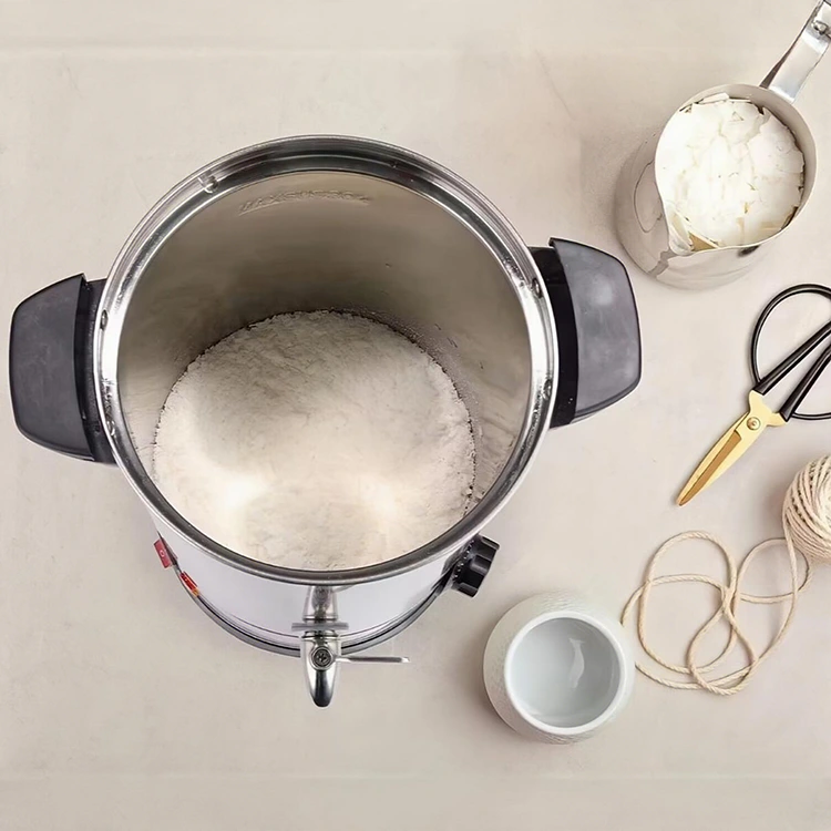 Nanjing FNAT เป็นโรงงานต้นกำเนิดในจีนที่เชี่ยวชาญด้านวัตถุดิบเทียน อุปกรณ์หลอมขี้ผึ้งแบบมืออาชีพของเราได้รับการออกแบบมาโดยเฉพาะสำหรับการหลอมขี้ผึ้ง ผลิตจากสแตนเลสเกรด 304 สำหรับใช้กับอาหารซึ่งมีความจุหลายขนาด (5 ลิตร, 8 ลิตร, 10 ลิตร, 12 ลิตร, 15 ลิตร, 25 ลิตร, 35 ​​ลิตร, 45 ลิตร ฯลฯ) มีตัวเลือกปลั๊กแบบสากล ก๊อกแว๊กซ์ที่ไม่อุดตันและทำความสะอาดง่าย การควบคุมอุณหภูมิ ฉนวนสองชั้น และการทำความร้อนสามมิติแบบเต็มแชสซีเพื่อความเร็วที่รวดเร็วและประสิทธิภาพเชิงความร้อนสูง คุณภาพคงที่ ผสมผสานความเป็นมืออาชีพและการใช้งานจริง เหมาะสำหรับการผลิตเทียนขนาดใหญ่และการใช้งานในอุตสาหกรรม